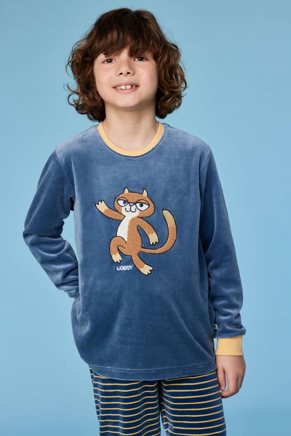 Blauwgrijze pyjama van velours. Het bovenstuk is blauwgrijs met de mouwboorden en de hals in een contrasterende gele kleur en een print van een kat. De broek is blauwgrijs en geel gestreept.