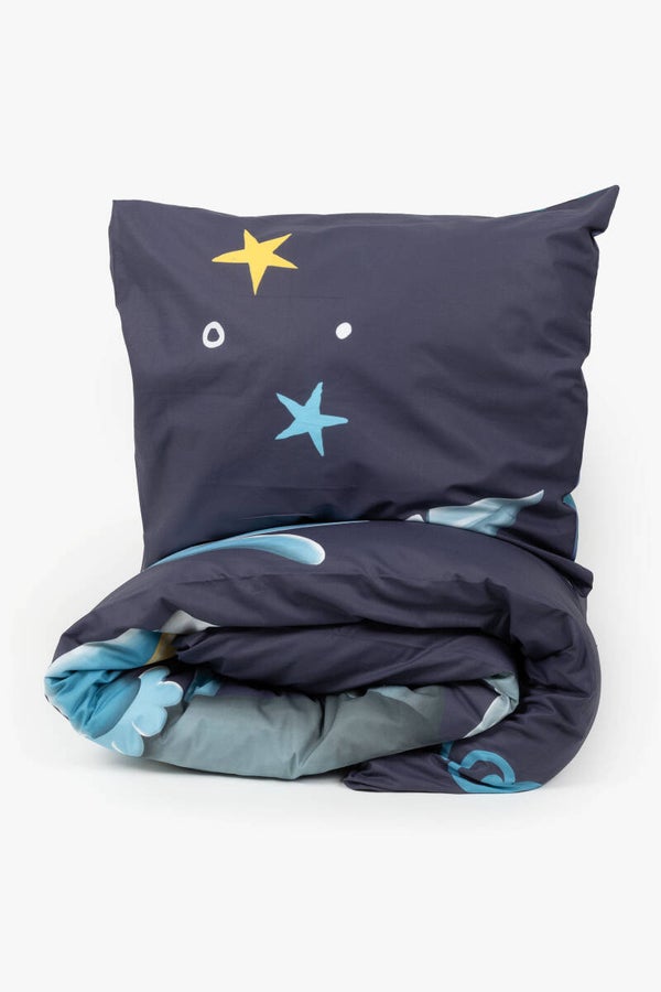 Eenpersoons dekbedovertrek met hoofdkussen in geweven katoen. Het overtrek is omkeerbaar. De ene kant heeft een blauwe duivenprint, de andere groen-blauwe strepen.