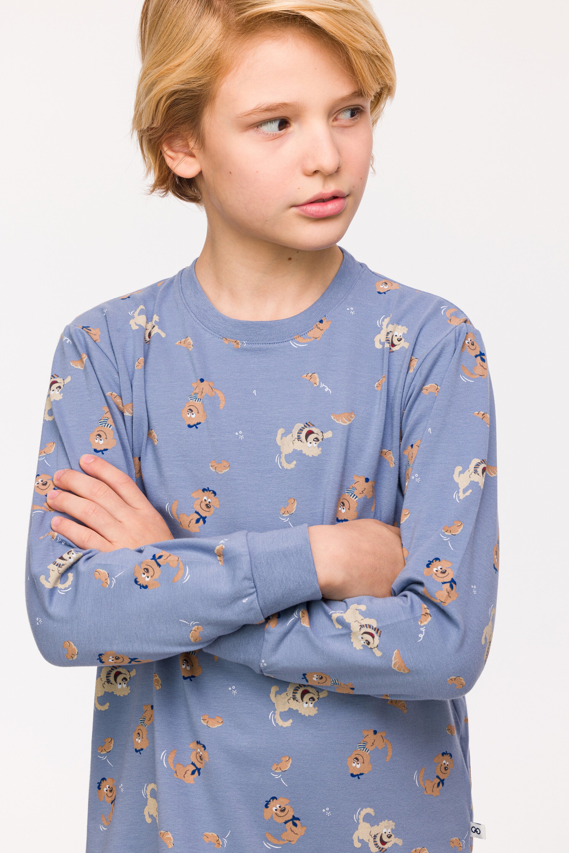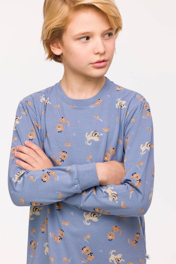 Woody pyjama voor kinderen van rekbaar en soepel jeansblauw katoen, met een kleurrijke alloverprint van onze Woody labradoodles. Deze comfortabele Woody pyjama met lange mouwen en lange broek draagt heel aangenaam en comfortabel door de stretchkatoen.