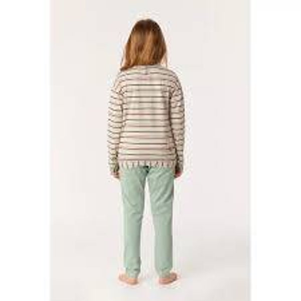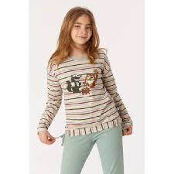 Meisjes pyjama in soepel katoen. De lange effen grijsblauwe broek wordt gecombineerd met een gestreepte top, die onderaan afgewerkt is met een rekzoom en hierdoor modieus bloest. De grote print van de Woody uil licht op in het donker. Perfect om een uiltje mee te knappen.