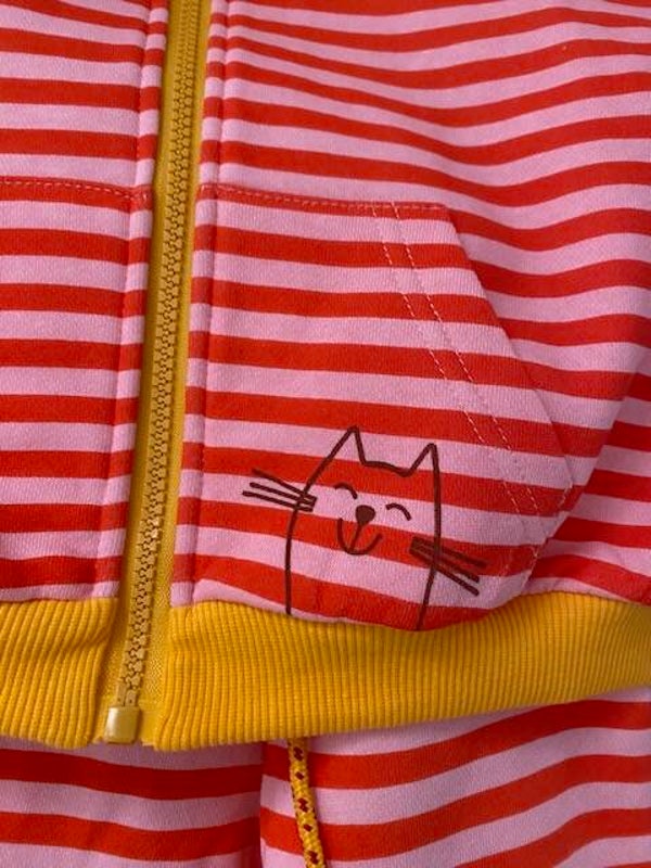 Roze-rode gestreepte joggingbroek van soepele sweaterstof gecombineerd met een gilet met leuke applicatie.