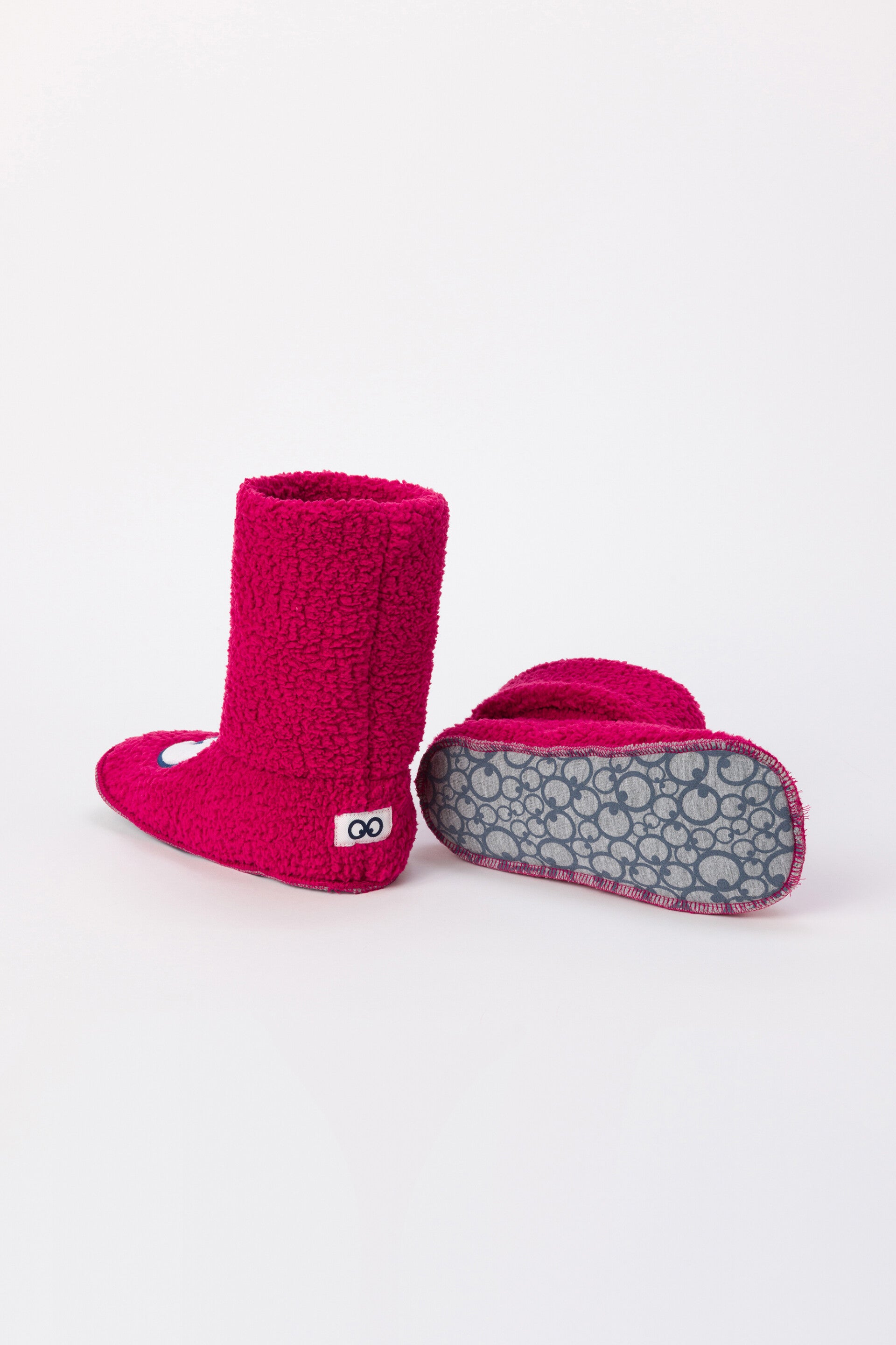 pantoffels in teddystof met ogen. De pantoffels kunnen omgeplooid of lang gelaten worden.