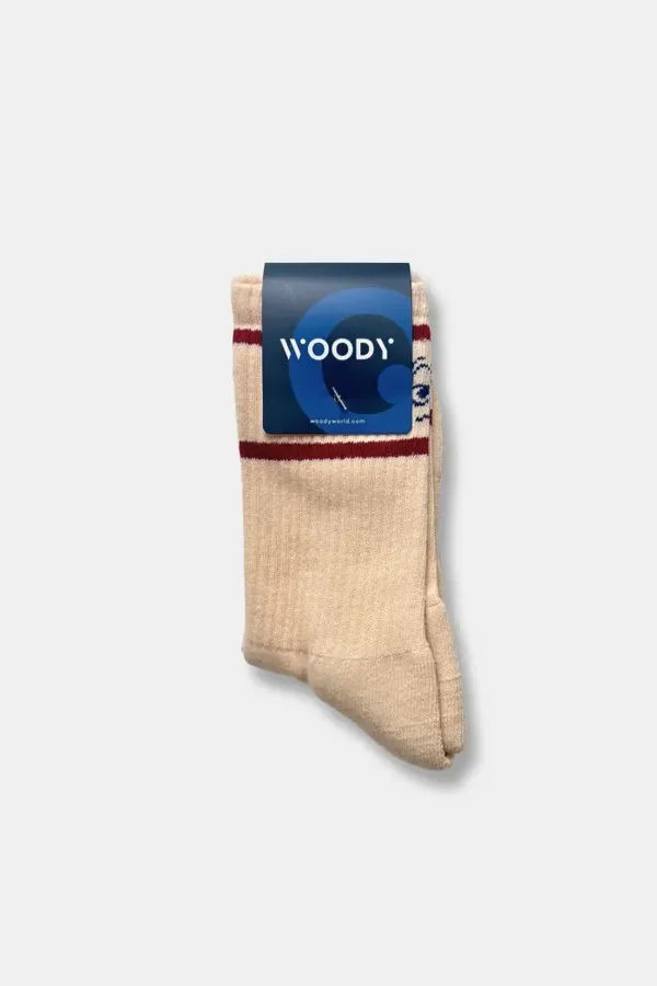 Gebroken witte sportsokken van fijn katoen. De sokken hebben een rood detail en tekst "Moody" ter hoogte van de enkels.