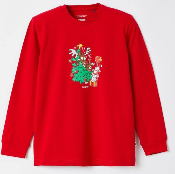 Woody kerstpyjama unisex, bestaande uit een truitje met een grappige tekening die oplicht in het donker en een broek met een alloverprint van rendieren.