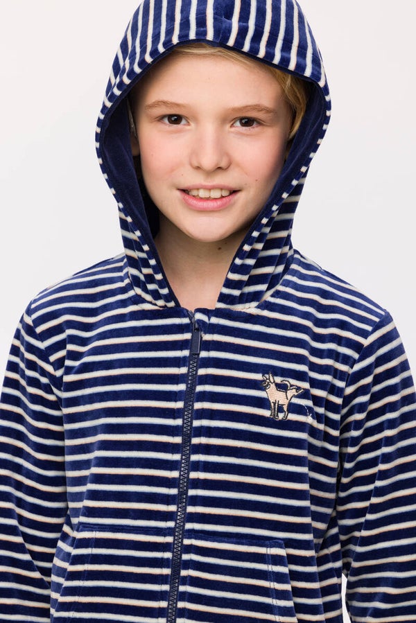 Blauw gestreepte Woody onesie voor jongens en heren van streelzacht velours. Wanneer je op zoek bent naar warmte, comfort en gezelligheid, deze onesie heeft het allemaal : een ruime pasvorm, lange mouwen en lange broek, een lange rits, een kap, 2 ruime zakken, maar vooral de zachte warme aangename stof hult je in welbehagen. En een toetsje Woody silliness mag natuurlijk ook niet ontbreken, de kleine applicatie al even goed bekeken ?