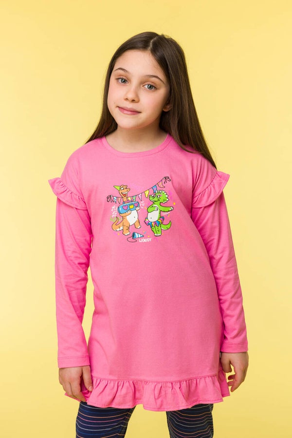 Deze leuke Woody winterpyjama heeft een tuniek, lange mouwen, een lange broek en een toffe print van disco dino's.