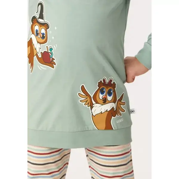 Meisjes pyjama van soepel katoen. De effen grijsblauwe tuniek heeft lange mouwen en een prachtige print van de Woody uil vooraan, en wordt gecombineerd met een lange gestreepte broek. Dit tuniek model heeft een normale pasvorm.