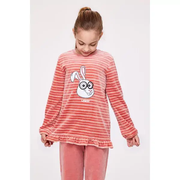 Fluweelzachte velours Woody pyjama voor meisjes. Zowel de lange broek, als de trui met lange mouwen, zijn onderaan afgewerkt met een fijn rekbaar biesje. Blikvanger is de aangestikte modieuze frons, en de mooie applicatie van de Woody Sneeuwschoenhaas vooraan op de trui.