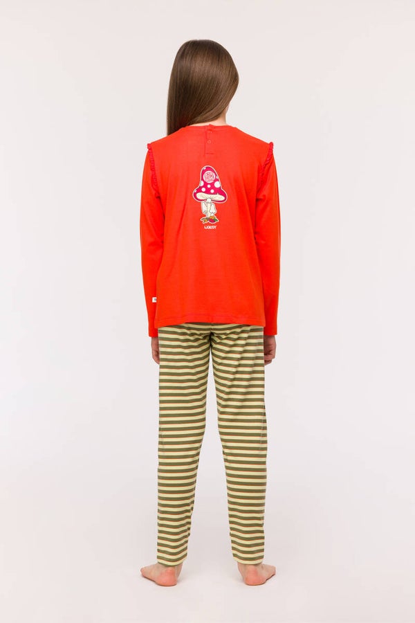 Woody pyjama voor meisjes in soepel katoen. Deze pyjama heeft een lange groen gestreepte broek, en een effen rode trui met lange mouwen, die een kantje meekregen aan de schouders. Dit kantje vind je ook terug aan de 2 opgestikte zakjes. Maar de kers op de taart is toch de prachtige opdruk van onze Woody eend voor- en achteraan. En deze licht op in het donker