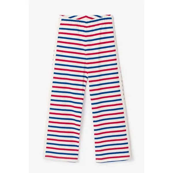 Woody bracht een exclusieve collectie uit samen met Anne Kurris, een sleutelfiguur in de Belgische kindermode. Deze blauw-rood gestreepte meisjespyjama in soepel katoen, bestaat uit een lange broek, en een trui met lange mouwen. De trui is zowel aan de pols, als onderaan afgewerkt met een brede rekker.