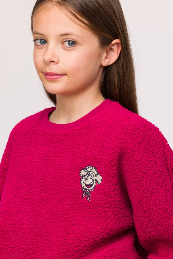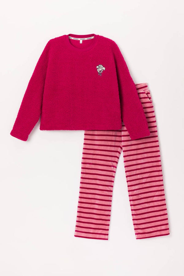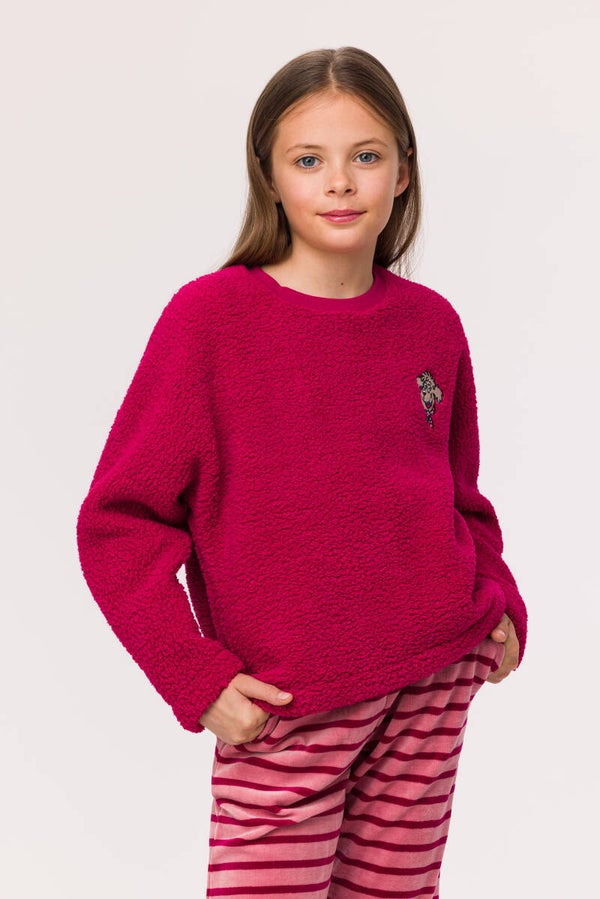 Deze mooie Woody winterpyjama of homewear, is lekker zacht en warm. De broek is in een zachte velours-katoen en de sweater is in heerlijke teddy fleece. Gezellig om in rond te lopen thuis.