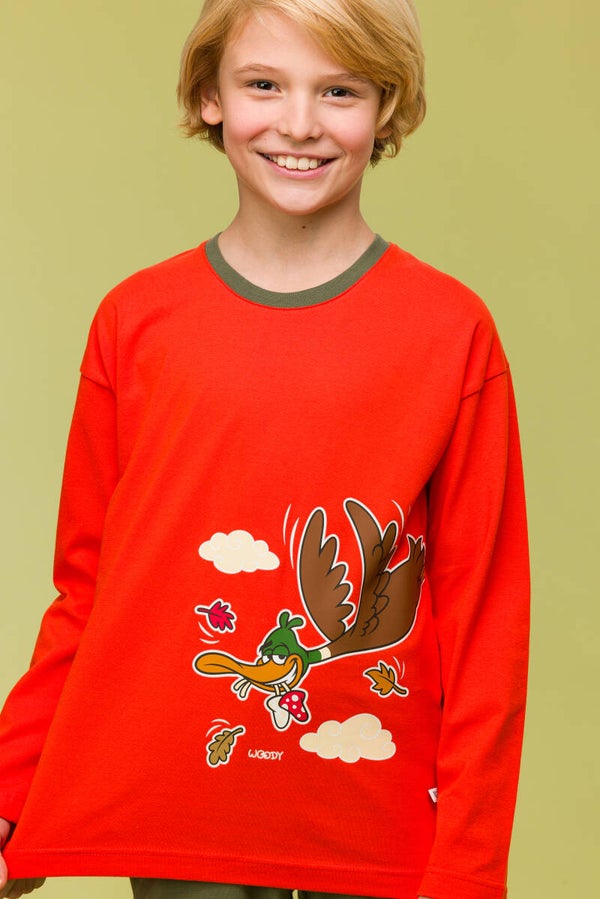 comfortabele Woody pyjama in soepel katoen voor kinderen. Deze set bestaat uit een lange effen kakigroene broek gecombineerd met een effen rode trui met lange mouwen. De witte delen van de print lichten op in het donker.