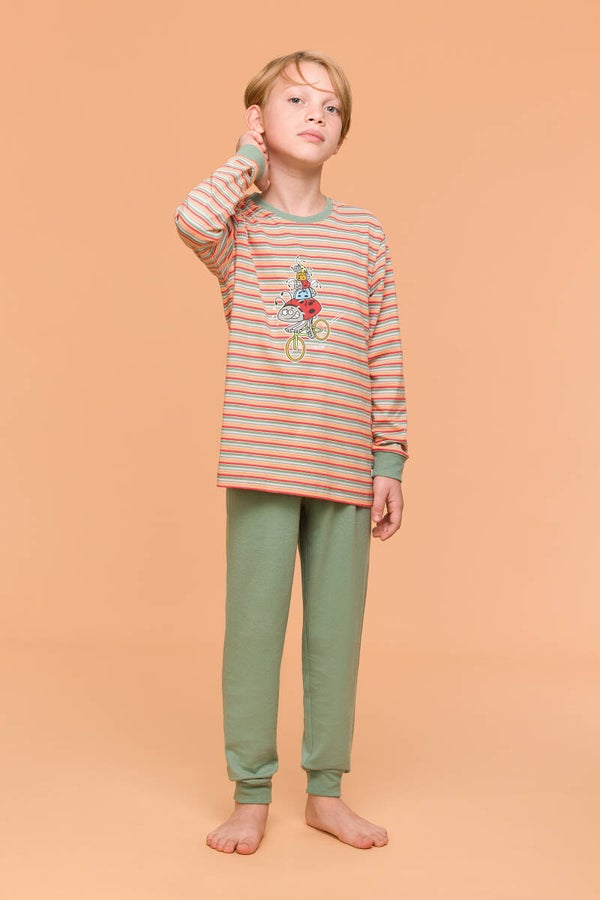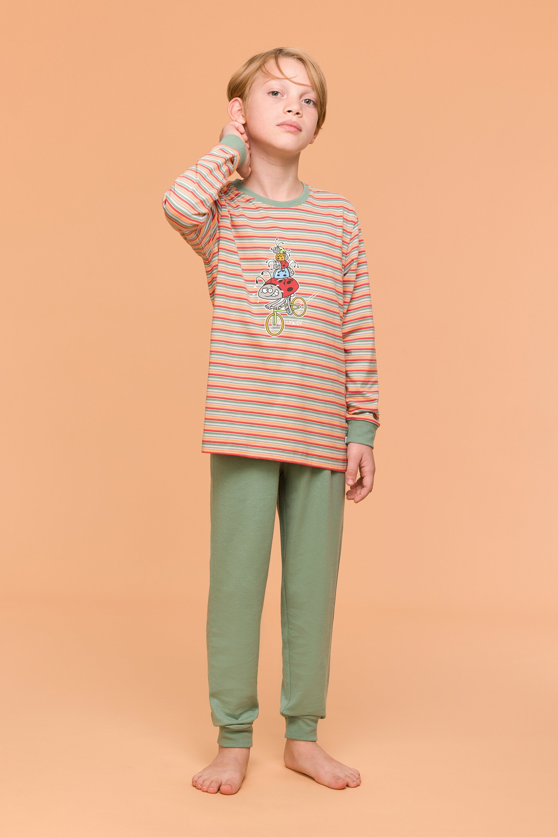 Jongenspyjama van soepel katoen. De trui, met lange mouwen, valt op de door de grote print voor- en achteraan, die oplichten in het donker! De mouwen en broekspijpen zijn afgewerkt met een brede, zachte boord. Een tijdloze Woody pyjama met een vleugje Woody humor.