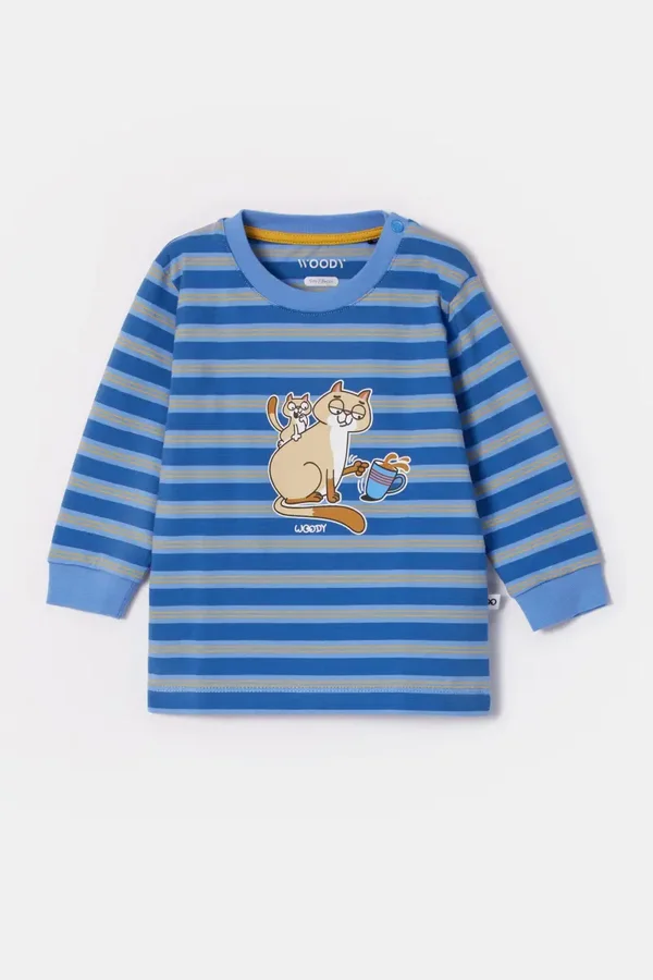 Het bovenstuk is gestreept en heeft een print met twee katten.