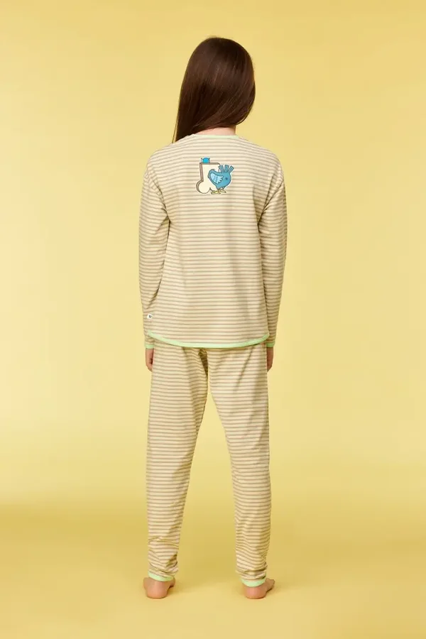 Groen-beige gestreepte pyjama van soepel katoen. Het bovenstuk heeft een kleine print op de borst en rug. Voor de maten 0m-8y is er een sluiting in de rug voorzien.