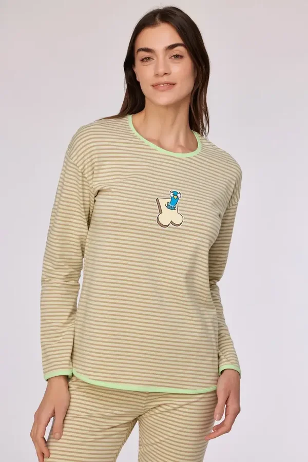 Groen-beige gestreepte pyjama van soepel katoen. Het bovenstuk heeft een kleine print op de borst en rug