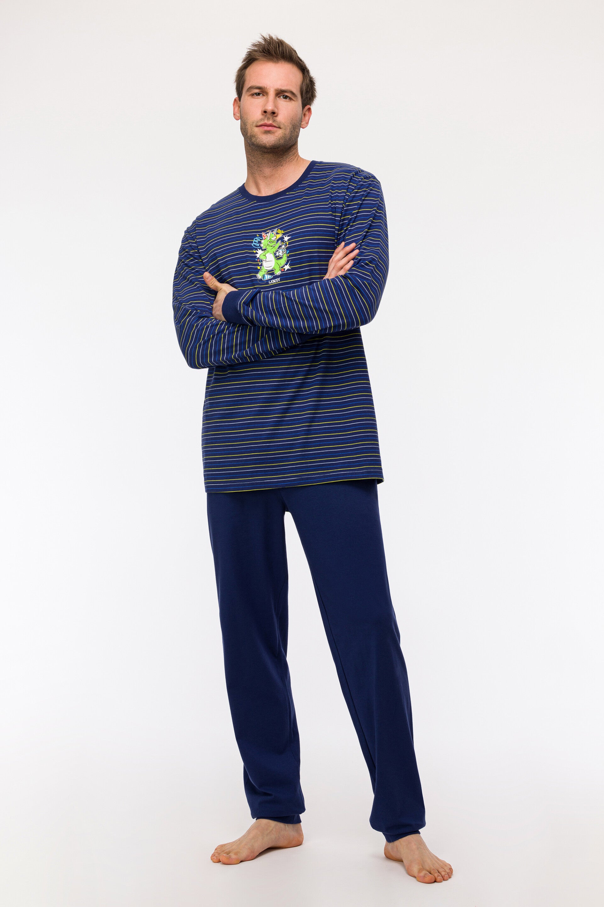 Ruime, comfortabele Woody pyjama in soepel katoen voor jongens. Dit model heeft een lange effen blauwe broek, en een gestreepte trui met lange mouwen, beiden afgewerkt met een rekbare (contrast)boord. Blikvangers zijn de mooie prints van de Woody Dino vooraan en achteraan.