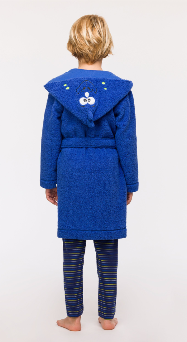 Unisex kamerjas van zachte, felblauwe teddystof voor kids Deze peignoir heeft een warme kap in het thema van onze Woody dino, lange mouwen, valt lekker ruim, en sluit vooraan met knopen.