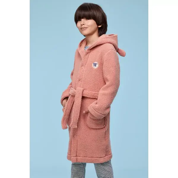 Unisex kamerjas van zachte, oudroze teddystof voor kids.Deze peignoir heeft een warme kap in het thema van onze Woody sneeuwschoenhaas, lange mouwen, valt lekker ruim, en sluit vooraan met knopen èn een ceintuur.