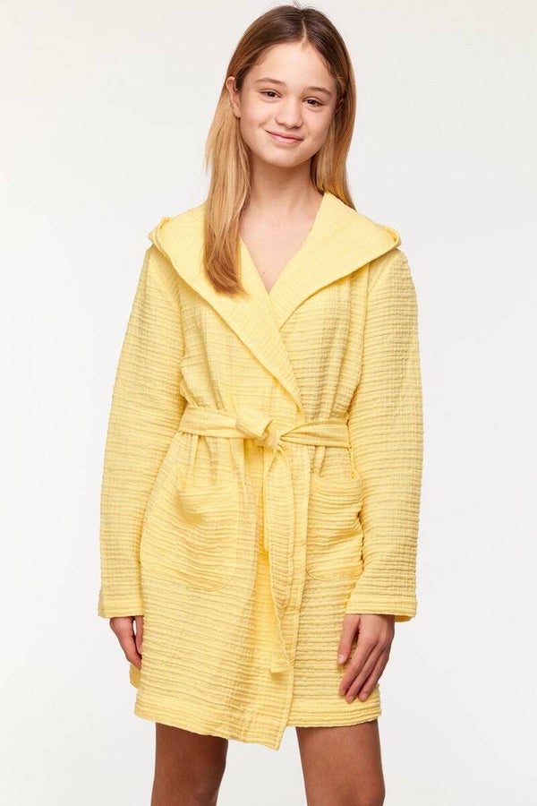 Studio Woody badjas voor meisjes in zacht geel fijnmazig hydrofiel katoen (tetra). Deze korte overslag kamerjas sluit met een ceintuur, heeft 2 zakken vooraan, en een ruime, comfortabele kap. Deze lichte zomerse badjas gaat gemakkelijk mee in je reiskoffer, en is ideaal na een verfrissende douche of zwembeurt.