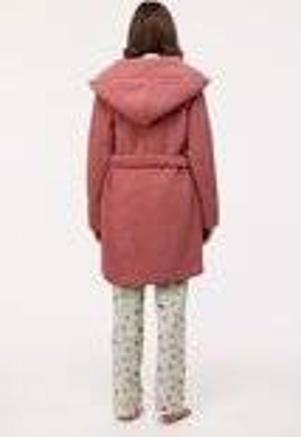 Oudroze badjas met kap in fleece materiaal voor meisjes, met kap, de sluiting is met een binder. Op het zakje staat een smiley.