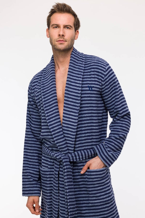 Mooie, lange heren kamerjas in een zachte badstof kwaliteit. Aangename heren kamerjas van Woody, kimono model met riem, knielengte. Ideaal voor na de douche!