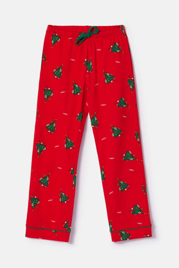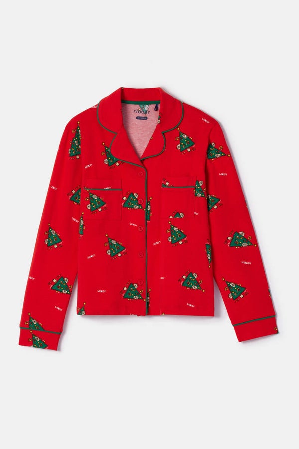 Rode doorknooppyjama voor meisjes en dames met een allover print van silly kerstbomen, in soepel katoen. Deze comfortabele Woody pyjama met lange mouwen en lange broek zit heel aangenaam door de stretchkatoen.