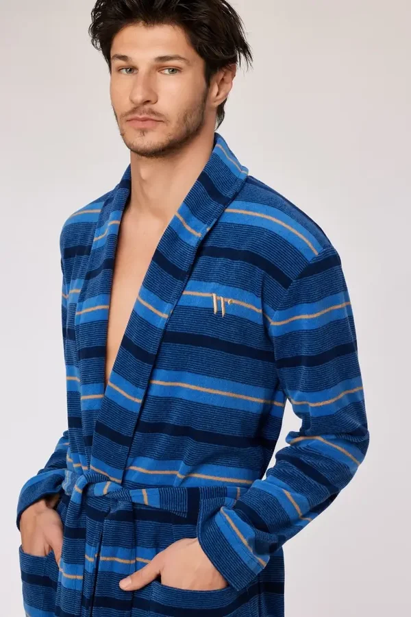 Blauw gestreepte kamerjas van polar fleece die tot onder de knie komt. De kamerjas heeft twee zakken en een ceintuur.