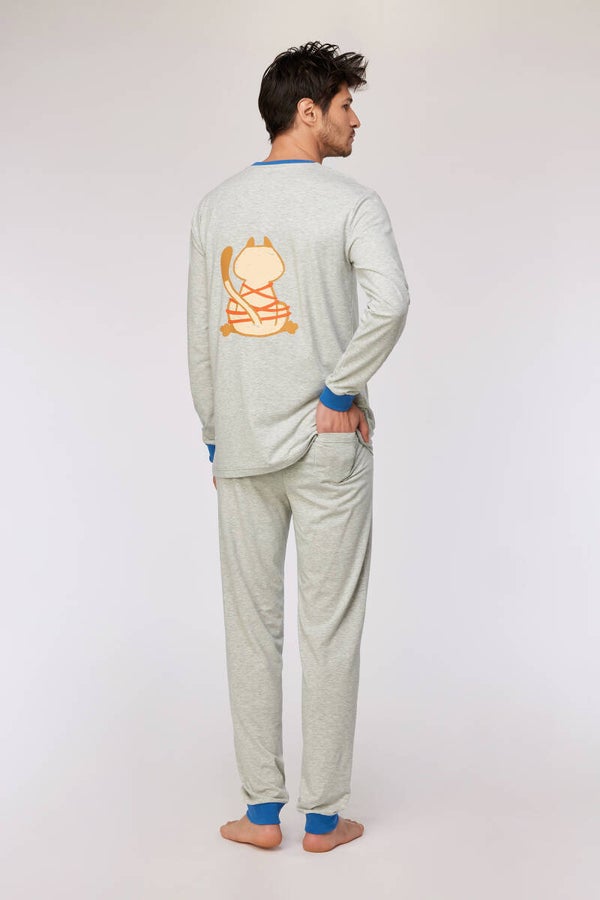 Jongens en herenpyjama pyjama van lichtgrijs rekbaar en soepel katoen. Vooraan op het shirt staat een silly print van de woody poes.