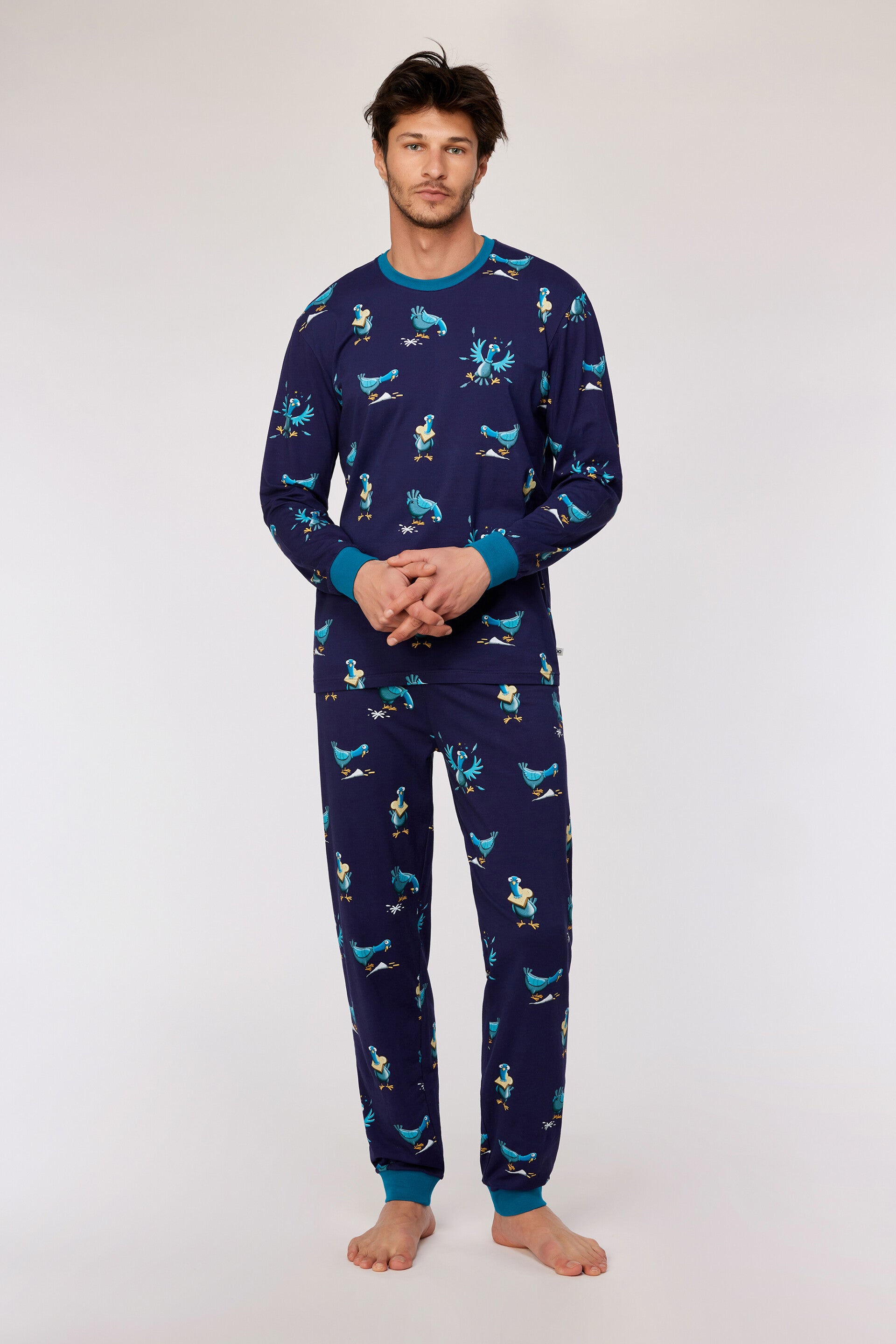 Donkerblauwe pyjama van soepel katoen. Het bovenstuk en de broek hebben een volledige duivenprint. De mouwuiteinden, hals en pijpuiteinden zijn in een lichter blauwe elastische boord.