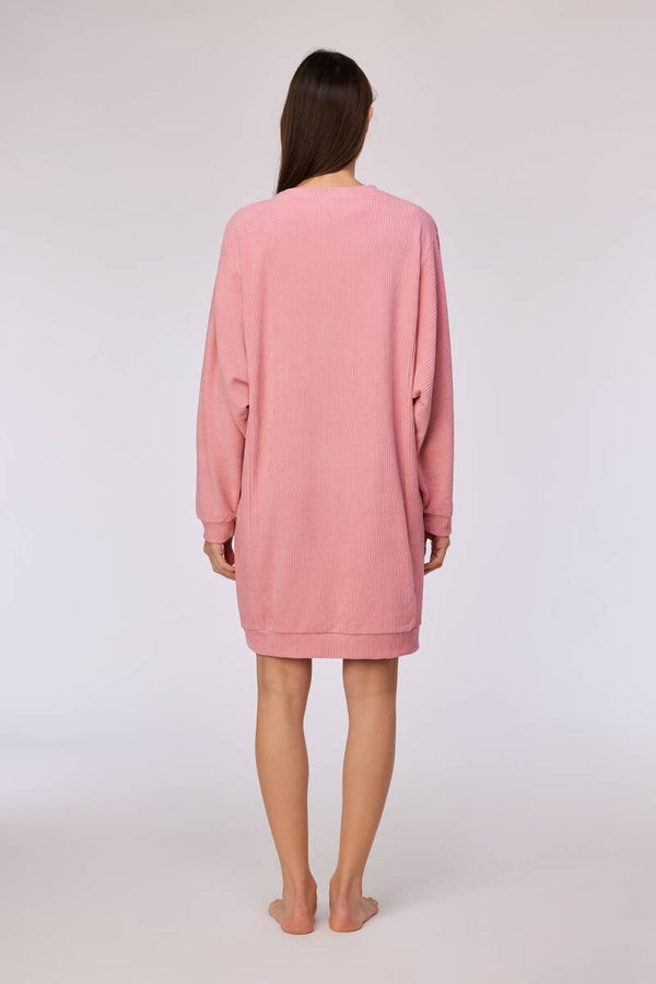 Roze gestreept slaapkleed van velours met lange mouwen. De mouwuiteinden en onderkant van het slaapkleed zijn afgewerkt met een rekkende boord. In het midden staat een grote print van een gestipte kat met laarsjes aan