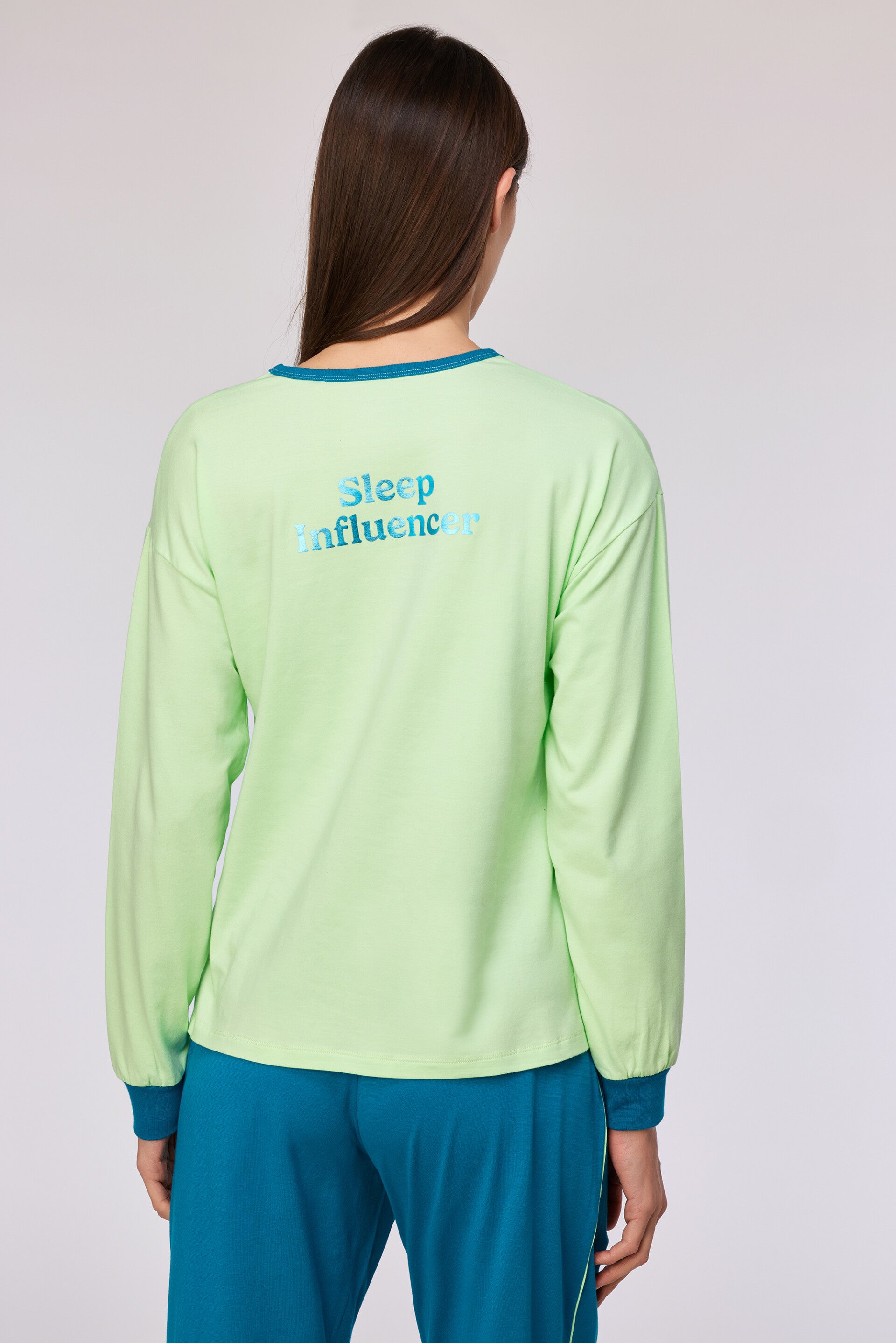Blauw-groene winterpyjama, gemaakt van soepel katoen. Deze pyjama met groene sweater en lange blauwgroene broek heeft de opschriften 'Dream big, sleep bigger' en Sleep influencer'.