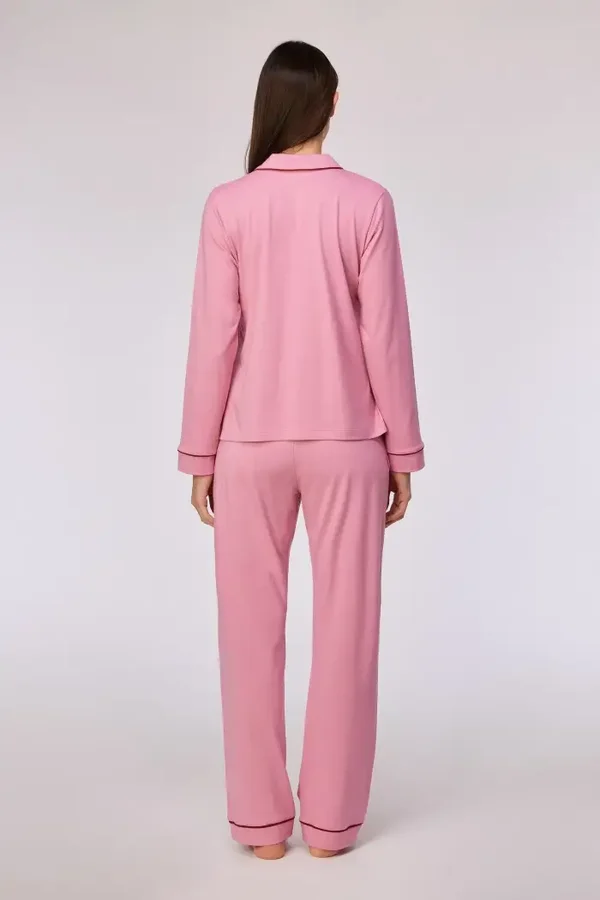 Roze winterpyjama, gemaakt van soepel katoen. Dit doorknoopmodel heeft een losse pasvorm.
